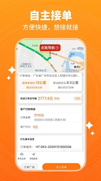 4、支持一键查看订单详情及目的地信息,并提供详细的导航路线指引,师傅可快速开启导航,准时高效到达施工现场,提升服务效率。