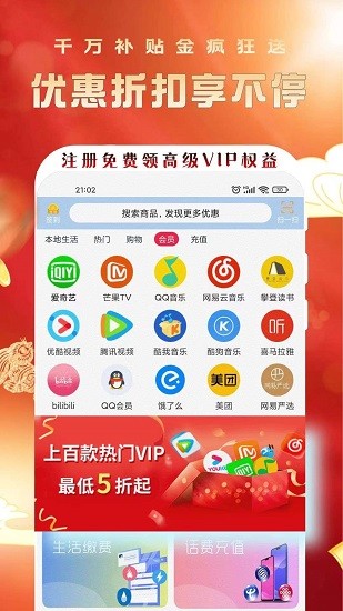 三网话费充值95折起,全国电费充值95折起,全网影音会员充值5折起