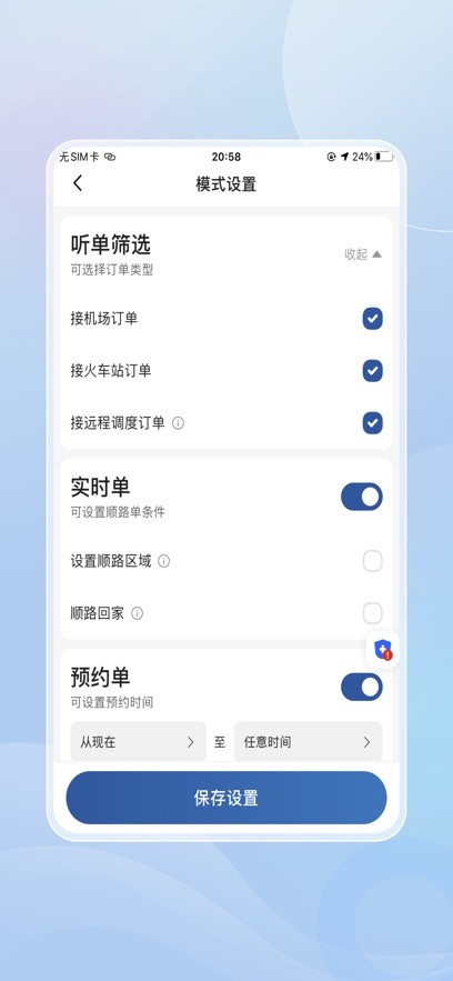 3、可以根据个人需求自由设置接单条件,如接单范围、车型匹配、服务时段等,系统将根据设定智能推荐最优订单,提升接单成功率