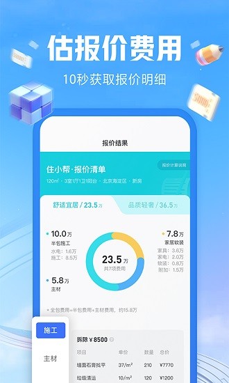 大数据科学算法,10秒轻松计算出装修预算,平台认证的在线设计师和本地装修公司提供免费专业的咨询服务,提升装修品质和空间利用,帮你装出理想家。