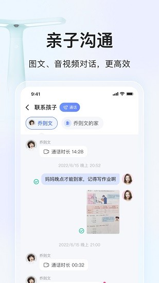 2、线上让家长轻松联系自己的孩子,支持普通图文对话以及音视频对话。