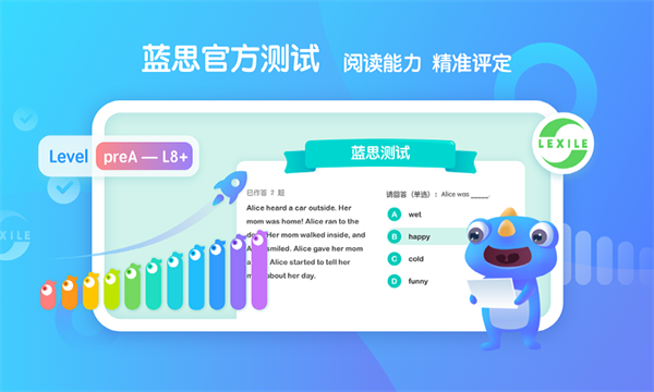 1.通过平台内置的Lens在线测试,准确评估学生的阅读能力,为学生制定个性化的英语阅读计划。 试题不重复,可多次进行,体现阶段进度。