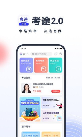 考途搜题软件是高途旗下的专门为大学生打造的学习平台,在这里可以让大学生寻找合适的课程资源,还能快速的进行搜题,让大学生日常学习非常的便捷,无论是升学考编还是日常考试都能来这里进行全面的复习。