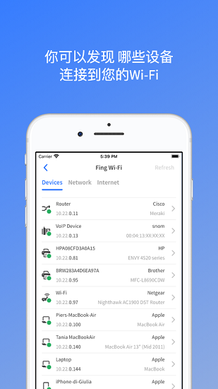 Fing官网版可以在这里帮助你实时监控连接的网络,无论是连接数据流量还是wifi都是可以测试的,帮助你识别网络的安全性,还可以帮助你查看自己家庭路由器有谁在连接,使用起来也是非常便捷,时刻查看自己网络是否安全。