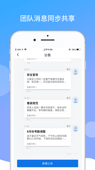 3、团队成员的动态都可以实时提醒,每日的考勤也可以显示。