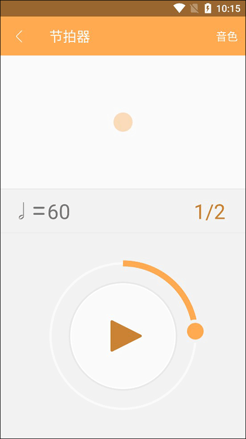 点击节拍器进入后,我们可以看见大大的一个播放图标,在图标周围有一个可以进行调整的圆环,大家可以通过拖动圆环上的小球来对节拍器的速度进行调整,等调整好了之后点击播放按钮就会自动播放节拍了,大家还可以通过右上角的音色来调整节拍器的声音,非常的方便。