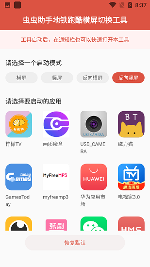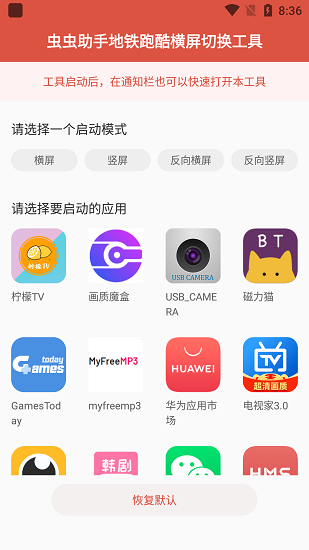 2、退出游戏,进入工具中点击【恢复默认】,即可退出横屏模式。