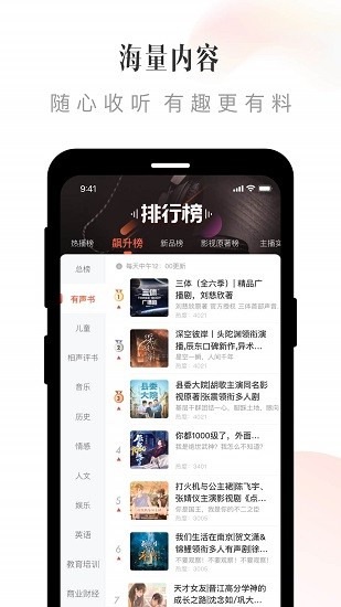 喜马拉雅听书可以让大家在这里免费听各种各样的有声小说,让大家不用自己阅读了,直接听专业的配音员为大家录制的有声书。线上将各种有声书资源进行了详细的分类,带啊喜欢什么风格都可以快速进行点播,每日都能极速听。