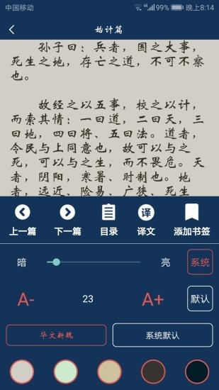 可以通过搜索名称和作者,立即就可以搜索到相应的文章,浏览到其对应的目录,让用户更方便阅读内容,领略古典文化的精粹和内涵。调节文章的上下篇章,切换主题或字体,也是阅读古典文学人士的选择,并配以译文,让读者更有意境。