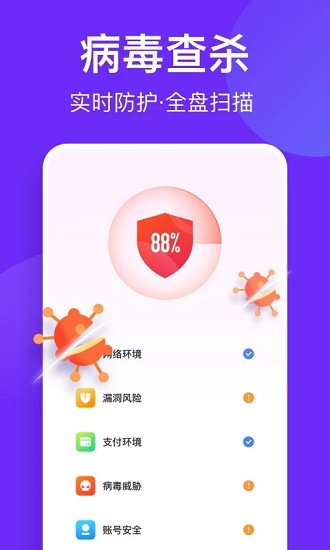 2、拥有超级强大的病毒查杀工具,在这时刻保护手机,不被病毒侵袭。