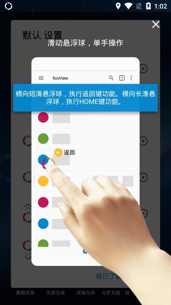 作为一个悬浮球,手势操作还是非常重要的一个功能。fooView支持上滑打开文件管理器、左滑返回、继续左滑回到主屏幕、下滑打开通知……