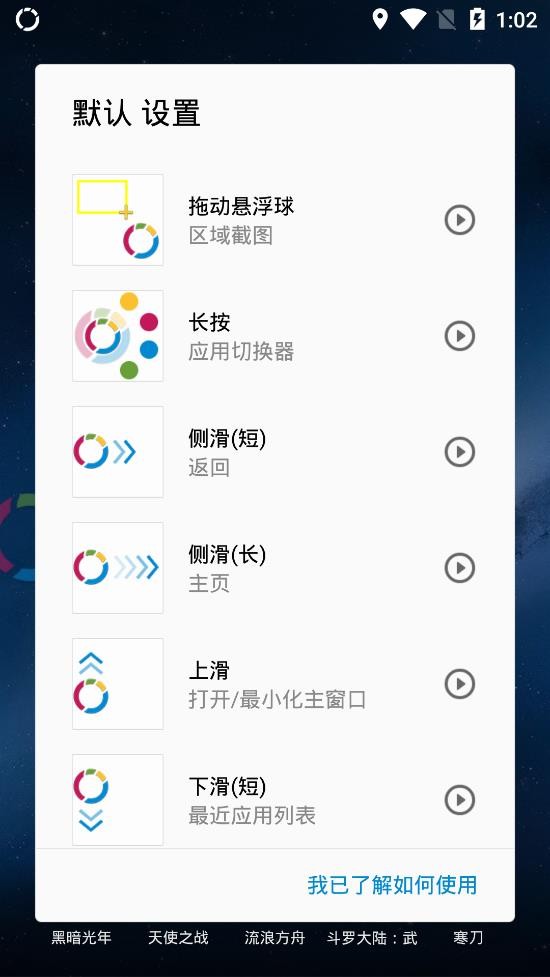 5) 悬浮球自定义手势, 已内置多个,可以到设置中查看, 如画圈截图, 横折下识屏, W涂鸦, Z剪贴板等
