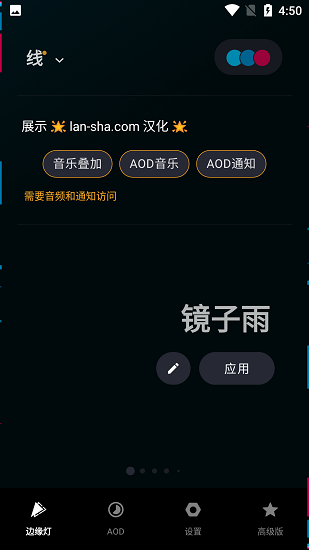 Muviz Edge汉化中文版可以让大家自由设置屏幕边缘闪光,内置了各种各样的样式,让手机在听歌的时候可以唤醒边缘闪光,能够根据音乐的节奏来进行闪光,让大家及时的调整闪光的效果,每次预览器起来也是非常方便的。