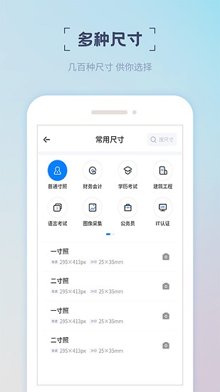 在本站下载并安装软件之后,在首页你可以在顶部搜索规格名称、尺寸,其下方则是一些常用的功能,如尺寸修改、裁切和底色更换。