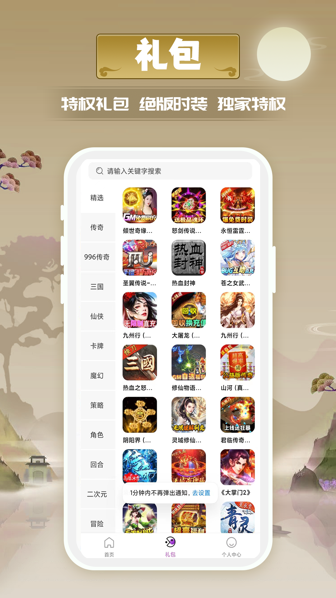 3.个人中心:查看个人信息、关注游戏、设置消息推送、充等等。