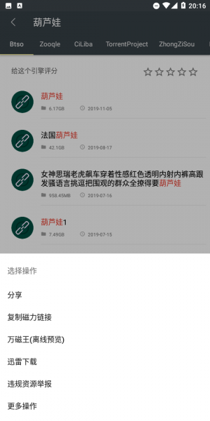 4、选择合适的搜索结果,可以直接用迅雷等磁性工具下载,也可以复制和共享链接。