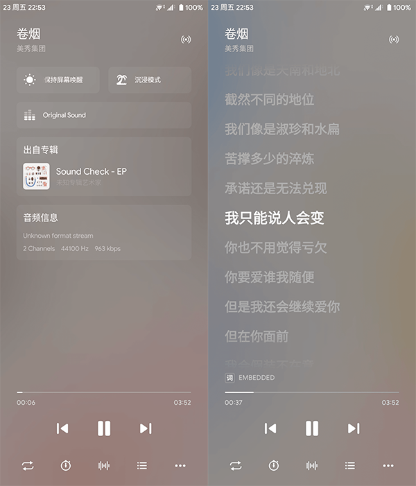3、再来看看听歌界面,歌曲界面由两部分组成,一面是专辑封面一面是歌词,这两面让你在听歌时不会觉得很单调。在专辑那一面会显示歌曲的格式类型和码率,对于音乐发烧友来说这项功能还是很特殊的。歌曲播放时的界面为,高斯模糊的流光,可以在设置里设置流光的效果,例如主题和流光效果的强弱。