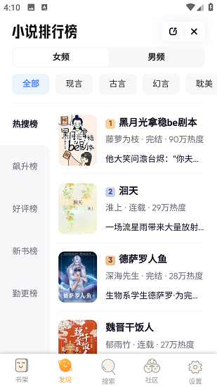 3、拥有详细的小说榜单可以查看,能够帮助大家找到很多精品小说。