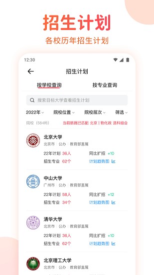 高考志愿填报手册APP内收集了全国数千所的本科、专科院校信息,包括学校简介、热门专业、历年分数线、招生计划、往年考生口碑等广大考生关心的热门数据。