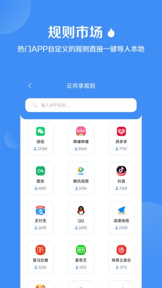除了内置规则外,在市场规则里还有好多好多云共享规则,像七猫免费小说,大师兄影视,哔哩哔哩等等都支持自动跳过广告。