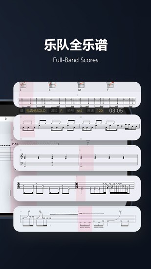 软件提供吉他、贝斯、鼓、钢琴四种大类乐器的演奏谱,并以线性乐谱的方式,根据节拍进行线性呈现。