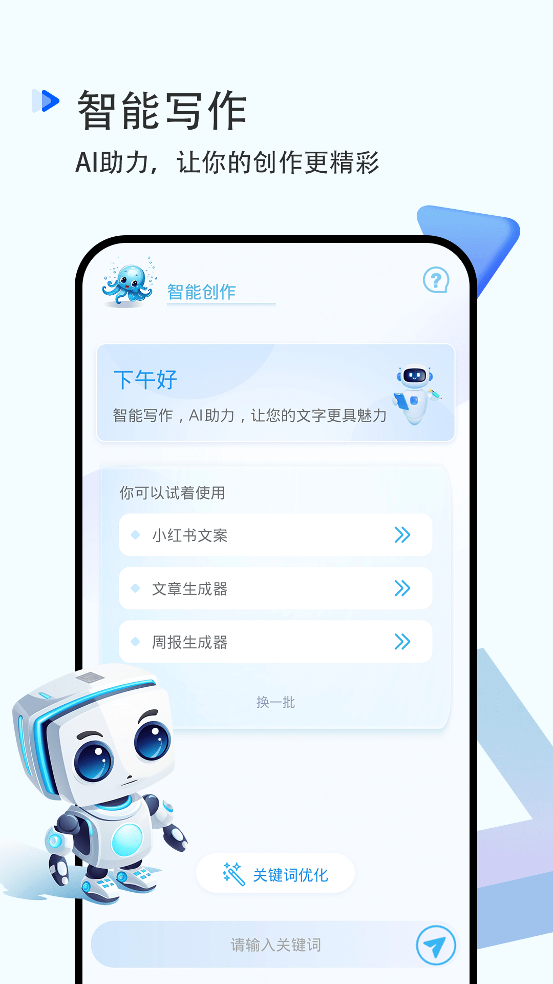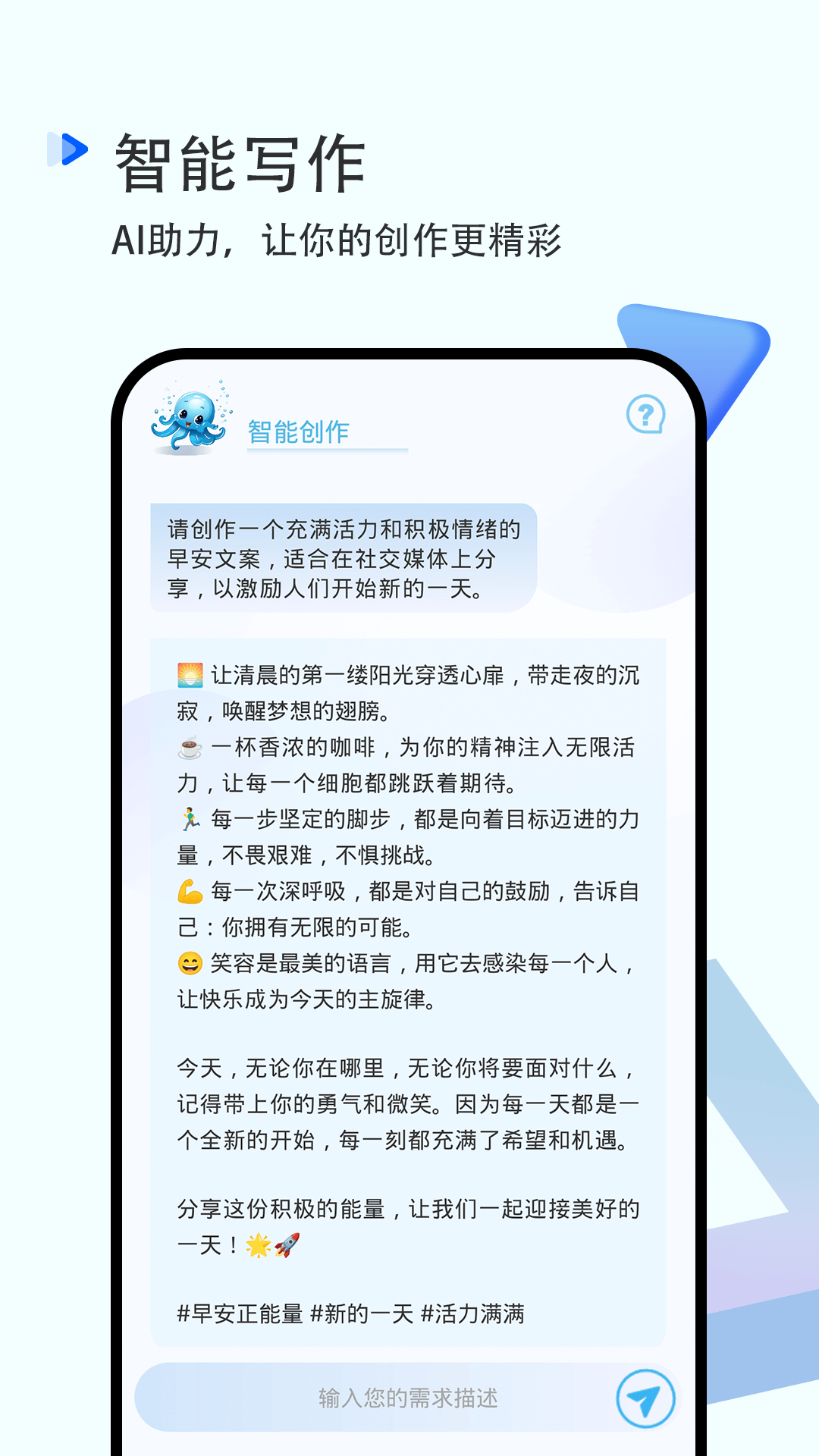 创造生动吸引人的文案?AI写作软件是您的文案创作助手!我们的AI助手提供创意灵感和写作建议,帮助您轻松创作博客、小红书文案、抖音快手文案、广告标语和社交媒体内容。从吸引读者到传达信息,我们为您提供全方位的支持,让您的文案更具吸引力。