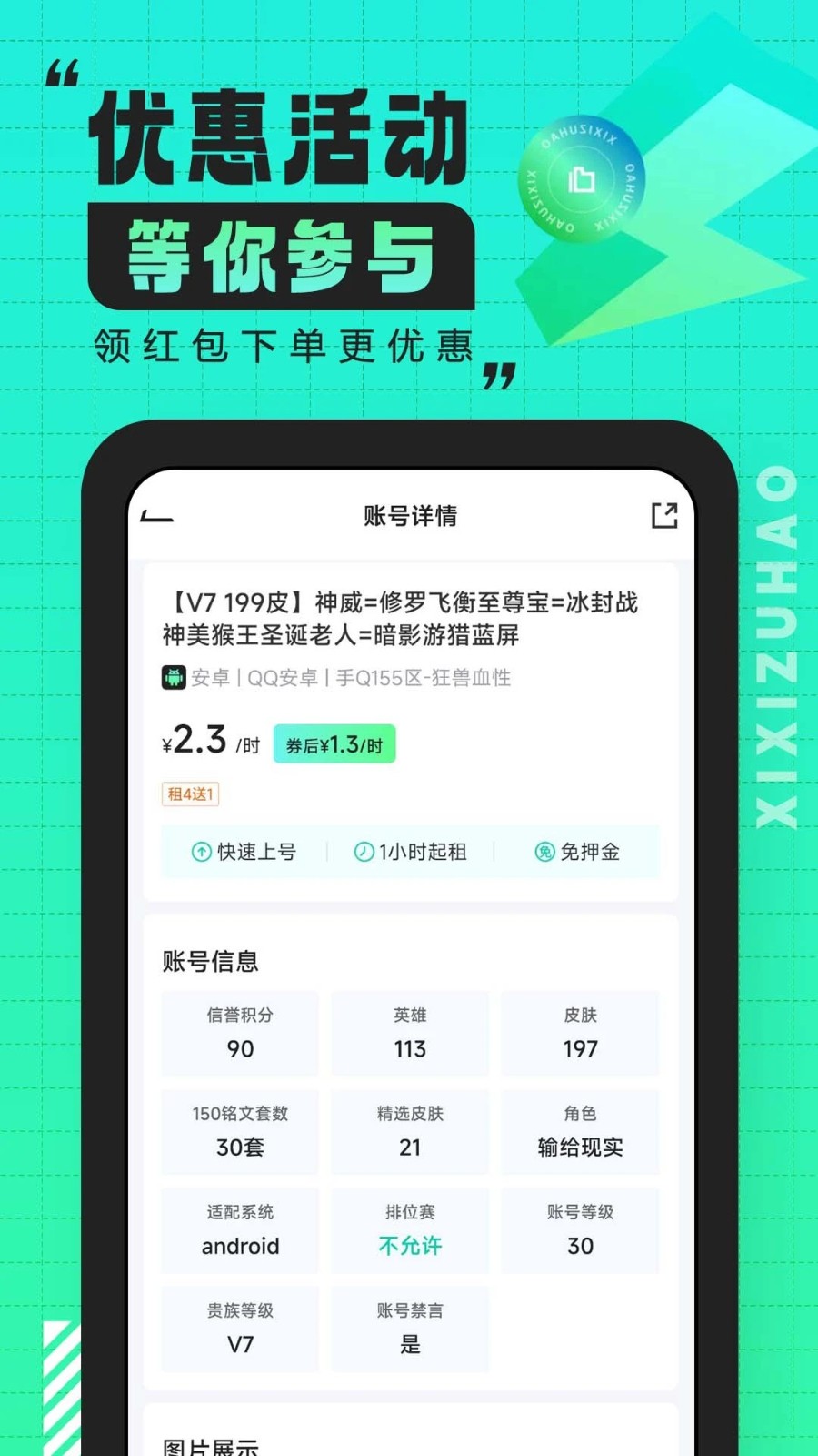 嘻嘻租号app是一款为大家提供高品质游戏账号的租借平台,在这里你可以选择自己想要体验的游戏,然后选择不同的需求就会为你推荐不同的账号。让你可以获得各种各样的游戏道具游戏角色,只需要少量的消费就能体验。