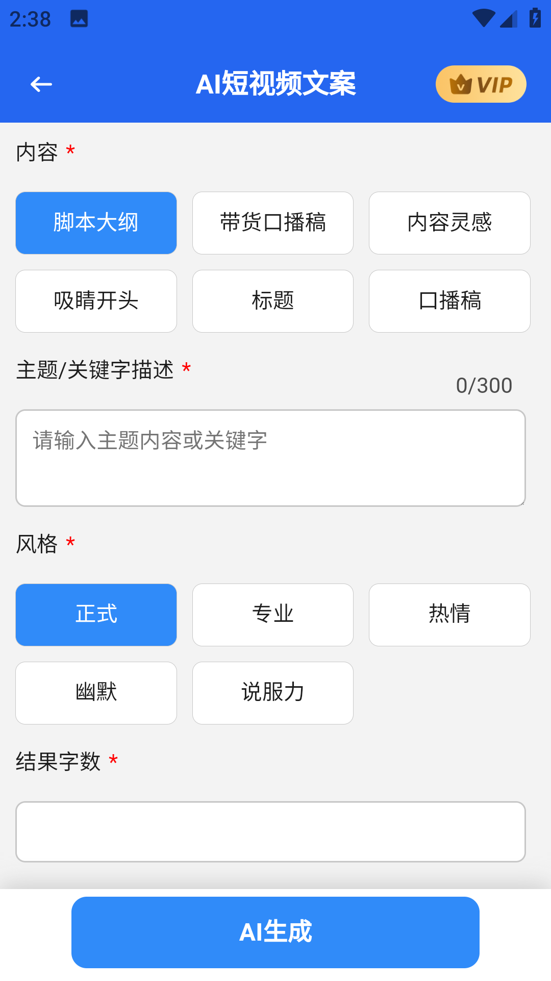 AI短视频文案app是一款可以一键生成短视频文案的ai智能工具,帮助从事短视频媒体工作的用户快速完成内容编辑。你只需要输入关键字,就能一键生成想要的内容文案,不论是口播,视频文案,视频脚本都能使用这款ai工具帮助你智能生成,根据不同的需求还能选择不同风格的写作内容。