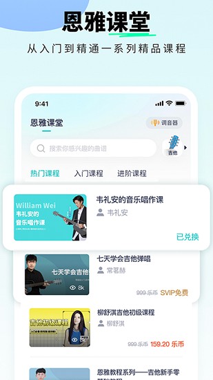 恩雅音乐最新版本可以让大家每天自由学习各种乐器,带来的课程资源都是非常优质的,能够在分类中自由的进行选择,使用起来非常的轻松。这里带有各种各样的小工具,都是可以辅助大家练习各种乐器,超级便捷。