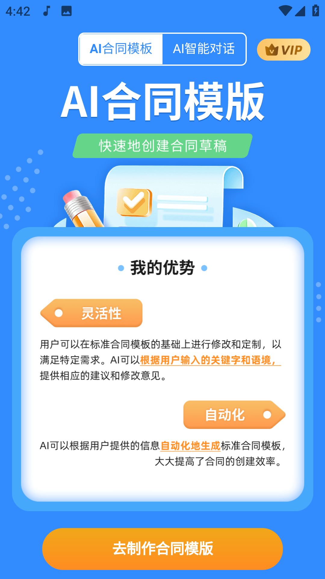 AI合同模版app是一款可以为大家一键生成合同模板的ai智能辅助工具,让你可以快速获得自己想要的合同模板。这款软件包含了贷款,买卖,租赁,委托,婚姻,劳动等多个方面的合同,你可以自由选择一键生成。