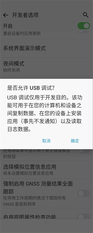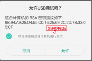 运行成功后会有提示: restarting in TCP mode port: 5555。 如果手机上提示是否允许调试,请允许。 如果不成功请检查USB驱动是否安装成功。