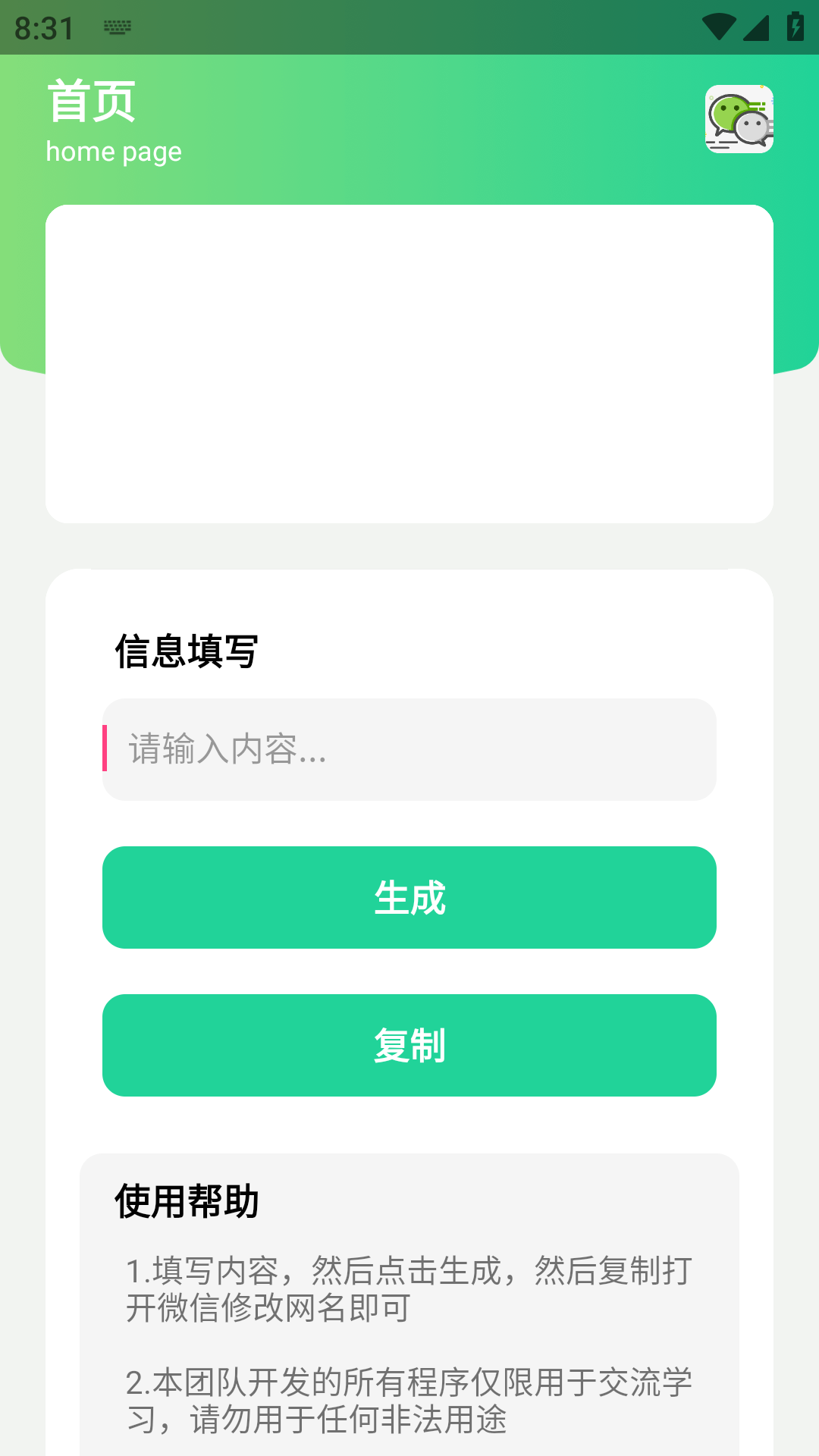 1.填写内容,然后点击生成,然后复制打开微信修改网名即可