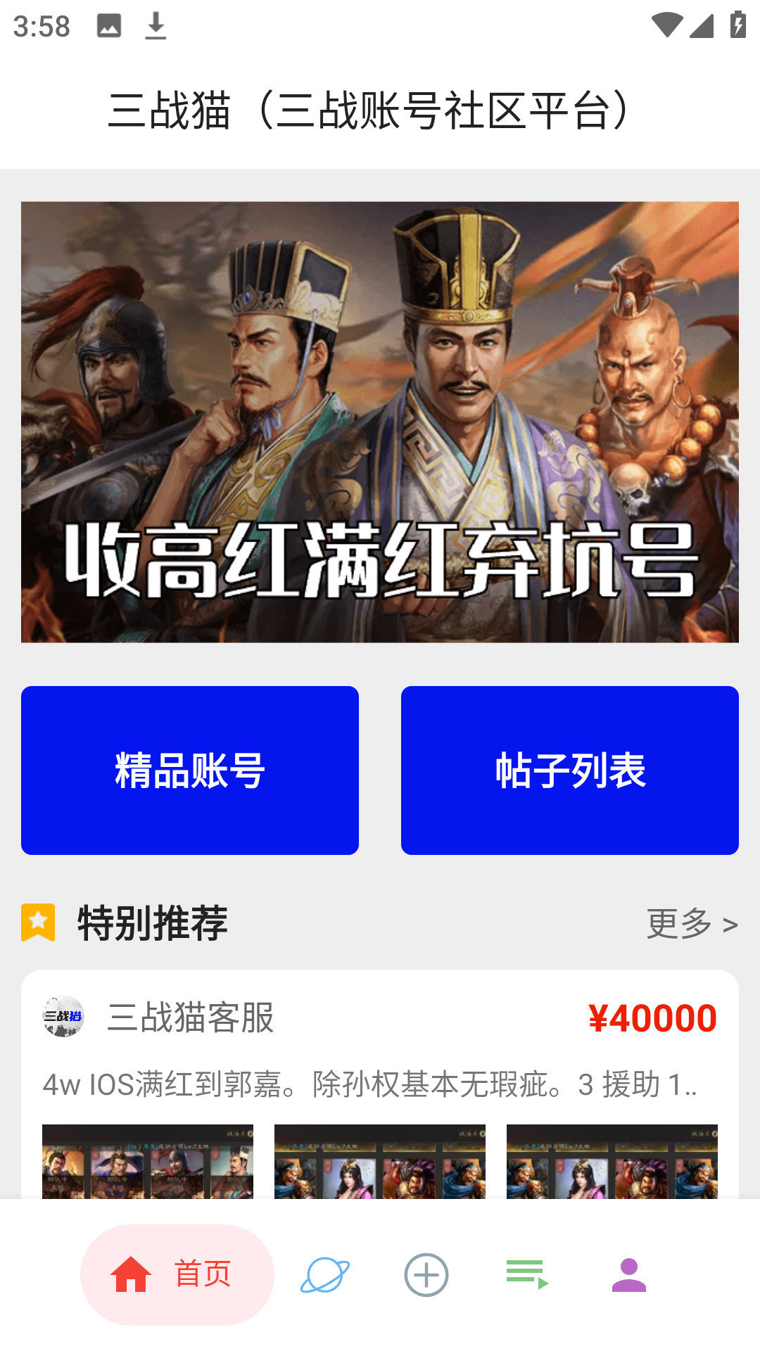 三战猫app是一款专为三国志战略版打造的游戏账号交易平台,买号的用户大家可以在这里发布自己想要收购的账号要求,等待有符合要求的用户来联系你。卖号的用户可以上传自己的账号截图和消息,等待有需要的用户来和你联系。平台保障交易的安全性,大家可以放心的完成账号交易。