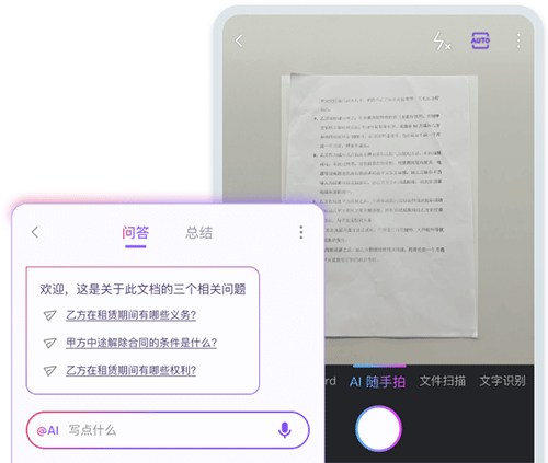 用手机拍下纸质文档,WPS AI 也能快速提炼信息。想要的信息直接问,准确的回答,立刻奉上。