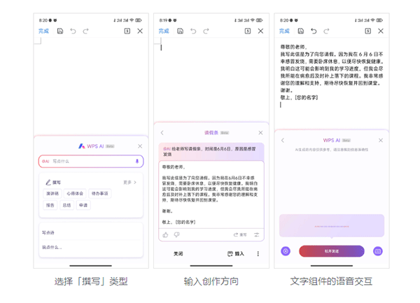 根据需要创作的方向,选择匹配的主题。如选择请假条 ,输入或语音录入关键词之后,WPS AI 便会生成带格式的内容。文字组件还支持「语音交互」创作,说出你想创作的方向,WPS AI帮你快速成文。