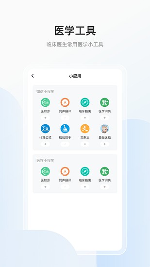 集成医知源,文献王,临床指南,病例交流,强医脑等多个微信小程序,以及翻译词典,同声翻译,医学计算公式,医学检验助手等多个小应用,为各个临床应用场景提供信息服务。