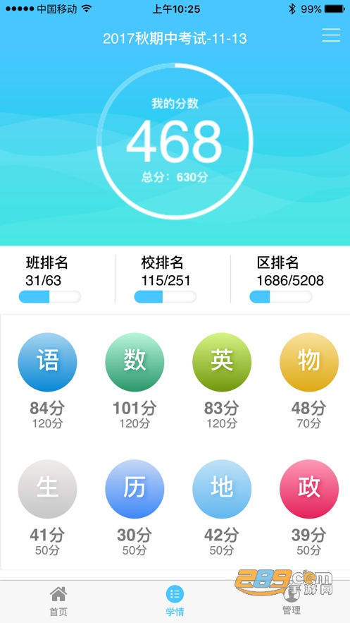 5、之后,点击底部【学情】菜单,就可以查看到各科的成绩,示例如图。
