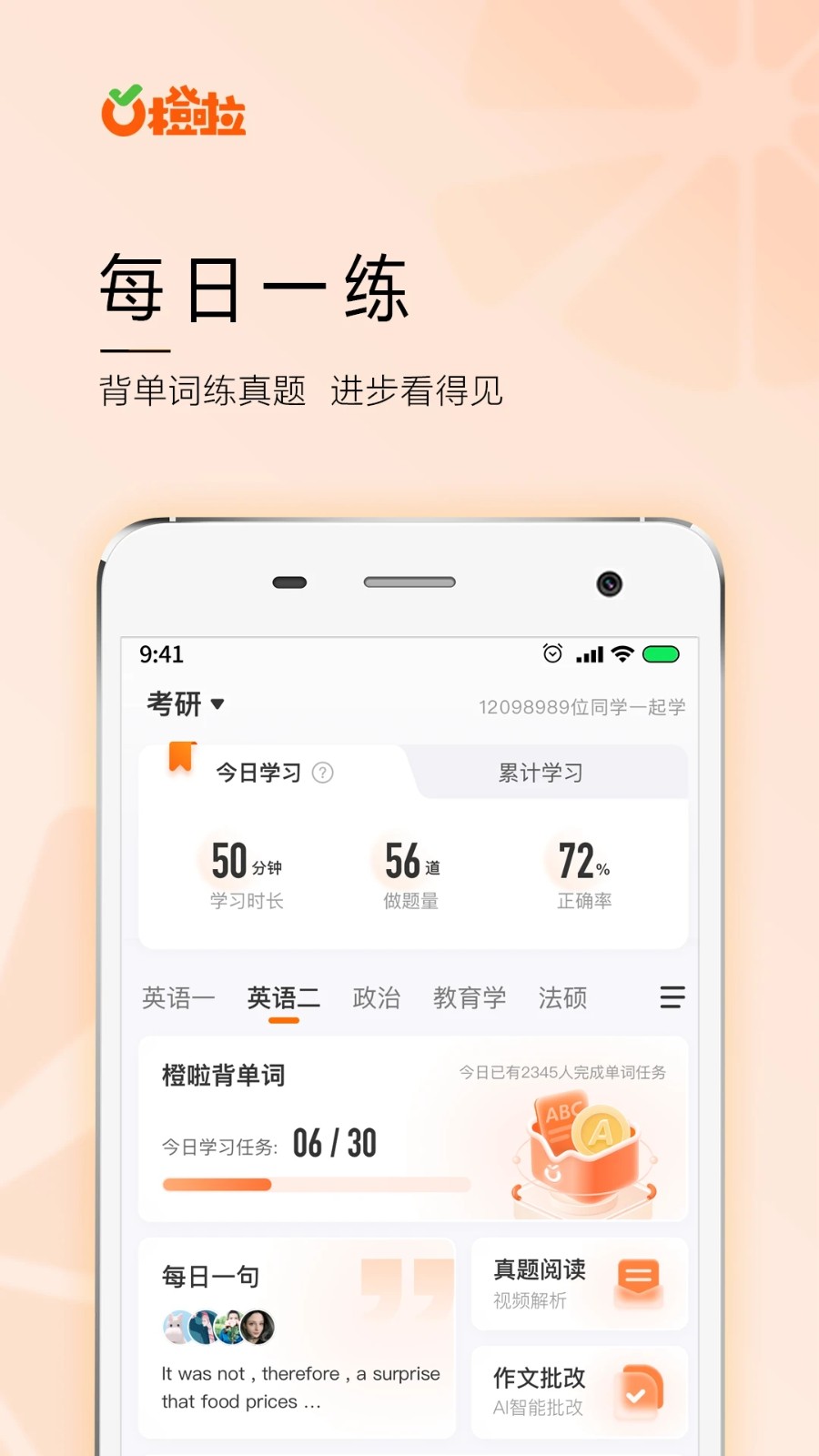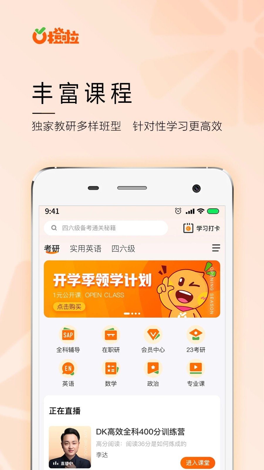 橙啦考研app是一款专为大家考研上岸打造的学习软件,有很多专业的学习资料,有很多知名的讲师,还有丰富的题库可以每日进行练习。会为大家记录错题让你可以反复进行练习,不论是考研,考公,靠四六级都能使用这款软件。