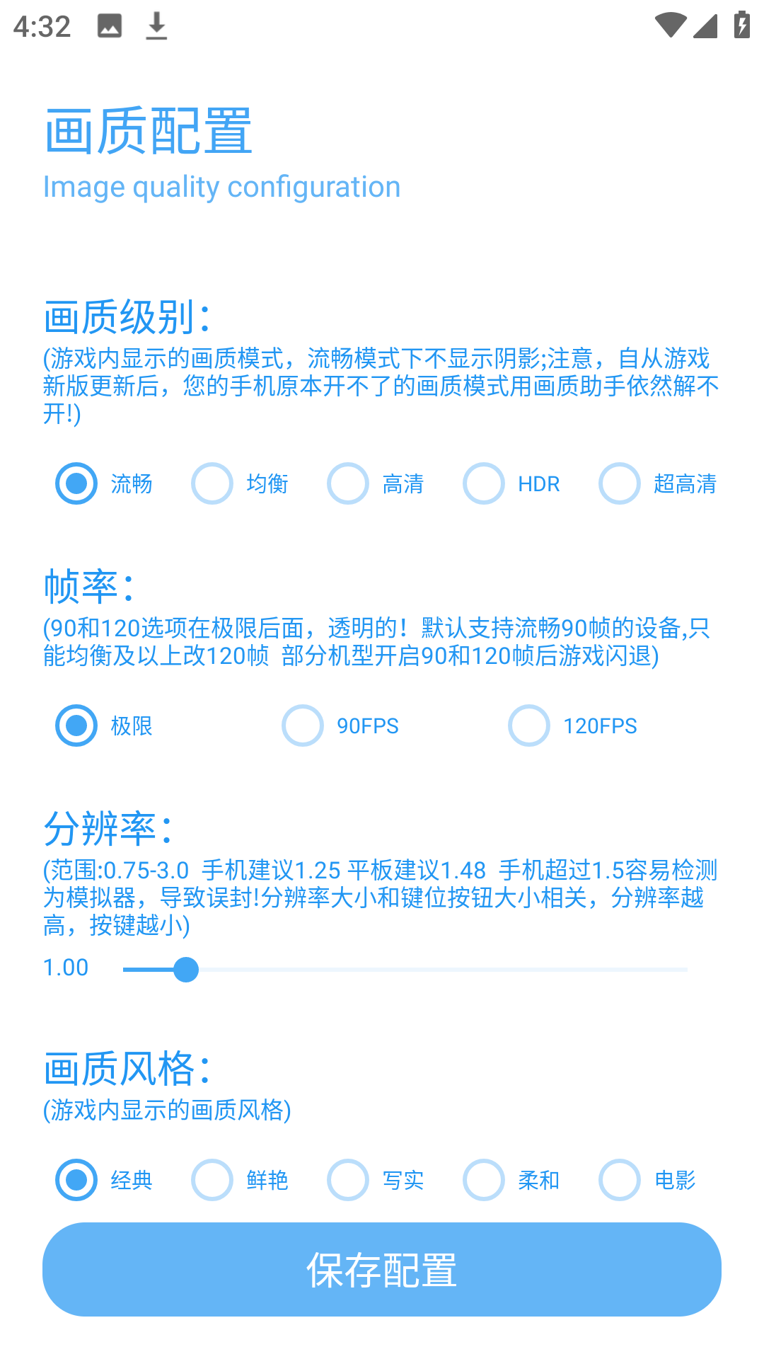 2、可以选择和平精英画质级别、帧率、分辨率、画质风格、抗锯齿、材质级别等,选好后点击保存配置