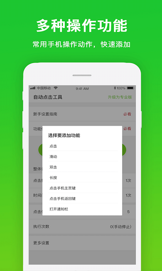 随时录点击或滑动操作,解放用户双手,实现连续点击加速,轻松设置点击频率、时间间隔。