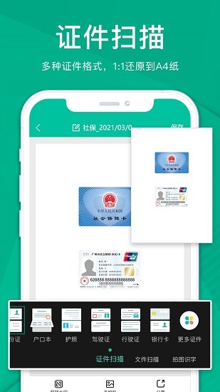 身份证、护照、驾驶证、营业执照拍照快速提取文字,拍照或相册选图,自动切边去杂乱背景,生成高清扫描件。