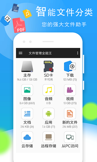文件管理全能王app可以让大家在这自由的管理手机上的所有文件,无论是手机内部的文件还是SD卡的文件都能进行管理,会实时的显示剩余存储空间,想怎么使用都可以的,提供的工具也是多种多样,每天轻松管理。