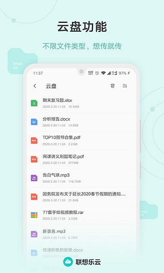 联想乐云app可以让大家日常在这里备份各种重要的文件,图文音视频等文件都是可以进行备份的,能够极速上传到你的云盘中,还可以在云盘中自由的查看各种文件,加载起来都非常快,日常还可以在云盘中进行分类。