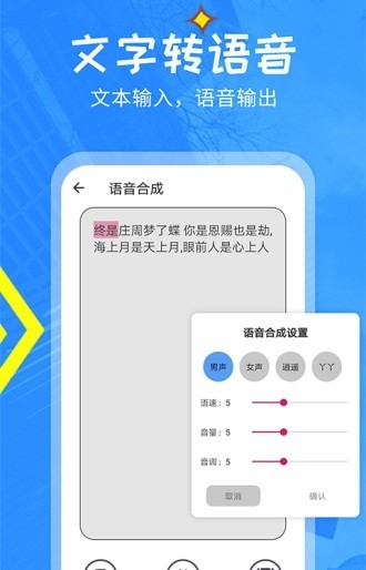 文字转语音助手是一款可以在线把文字转换成语音的应用软件,用户通过导入文本以转换为语音,并提供多种语音选项供您选择。您可以提取视频和图像文本,或者合成视频语音。动画、CG、影视、短视频都可以合成画外音,赶紧下载试试吧。