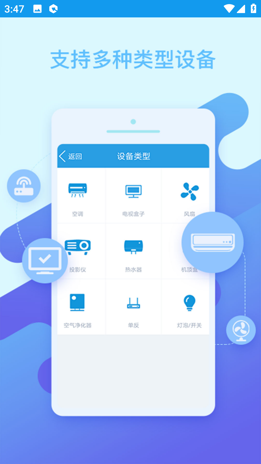2.该应用程序也是一款真正通用的遥控器,不仅可以远程控制电视,还可以远程控制家中的空调、风扇、机顶盒、网络盒等。使用您想要的任何遥控器,您都可以用一只手控制所有智能家居设备;