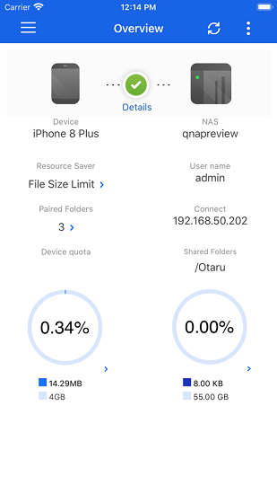 透过「总览」 页面,您可轻松检视已同步的行动装置与 NAS 的详细联机资料,包含:同步状态、装置信息、用户账号、联机信息、已配对的文件夹、存储空间状态等等。