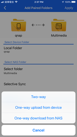 「管理配对文件夹」功能,让您将 NAS 上的文件夹与行动装置上的文件夹进行个别配对,让配对好的文件夹无缝进行档案同步。