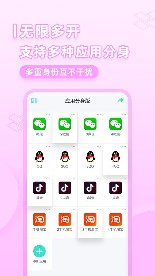 支持微信、淘宝、抖音、拼多多等生活社交软件,同时也支持各种游戏app的多开。