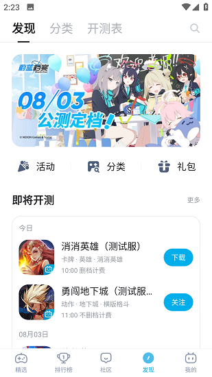 6、点开发现,可以查看最新测试和公测的游戏。