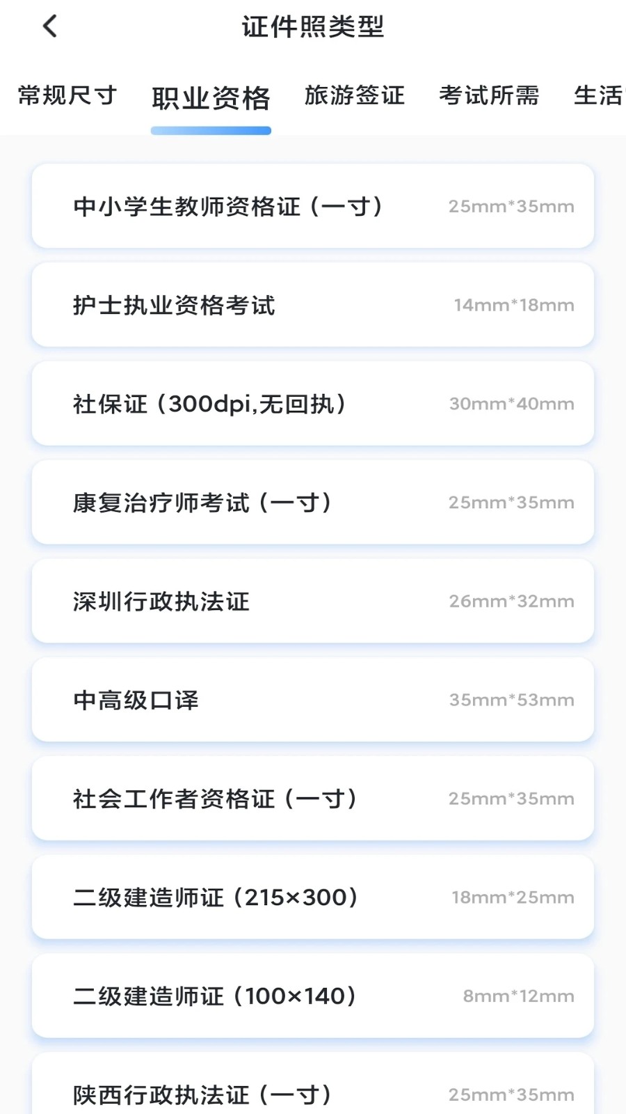 2.选择证件照制作页面,会有不同的规格不同的专业可以选择